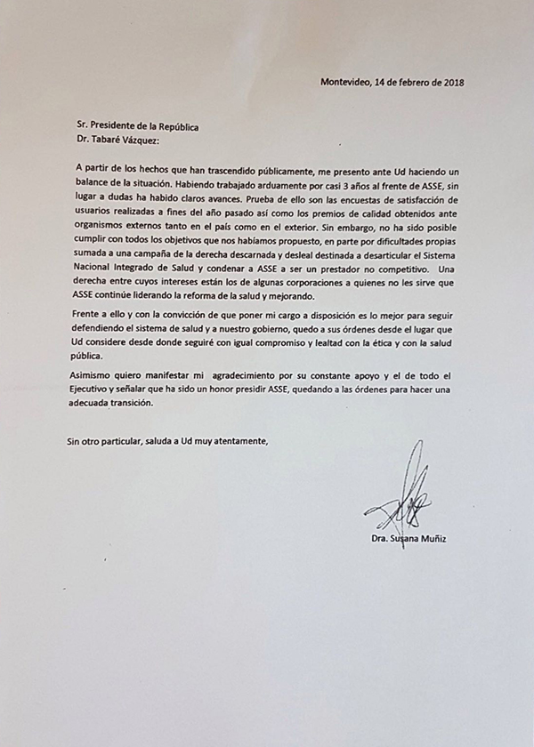En la carta, a través de la cual puso su cargo a disposición del presidente Tabaré Vázquez, Muñiz afirmó que “no ha sido posible cumplir con todos los objetivos” que se había propuesto para ASSE.
