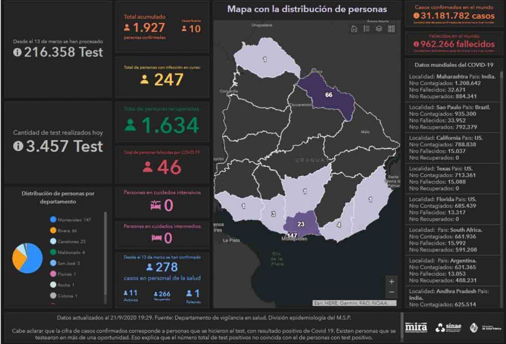Del total de casos positivos acumulados, 1.634 ya se recuperaron y 46 fallecieron. Además, hay 278 casos que corresponden al personal de la salud. De los cuales, 266 ya se recuperaron, 11 están cursando la enfermedad y 1 un profesional de la salud falleció en abril.