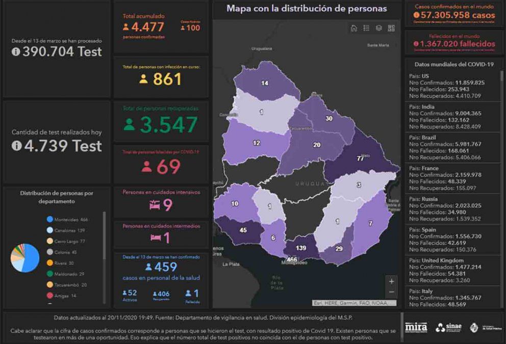 En tanto, los departamentos con casos activos al día de hoy son 16: Artigas, Canelones, Cerro Largo, Colonia, Flores, Lavalleja, Maldonado, Montevideo, Paysandú, Rivera, Rocha, Salto, San José, Soriano, Tacuarembó y Treinta y Tres.