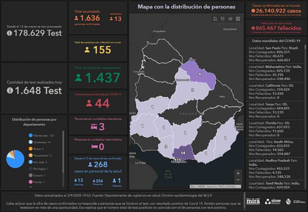 Según el último informe epidemiológico del Sistema Nacional de Emergencias (SINAE) actualmente hay 155 personas cursando la enfermedad, y tres de ellas se encuentran internadas en cuidados intensivos. Además, los departamentos con casos activos al día de hoy son 11: Canelones, Flores, Florida, Maldonado, Montevideo, Río Negro, Rivera, Rocha, San José, Soriano y Tacuarembó.