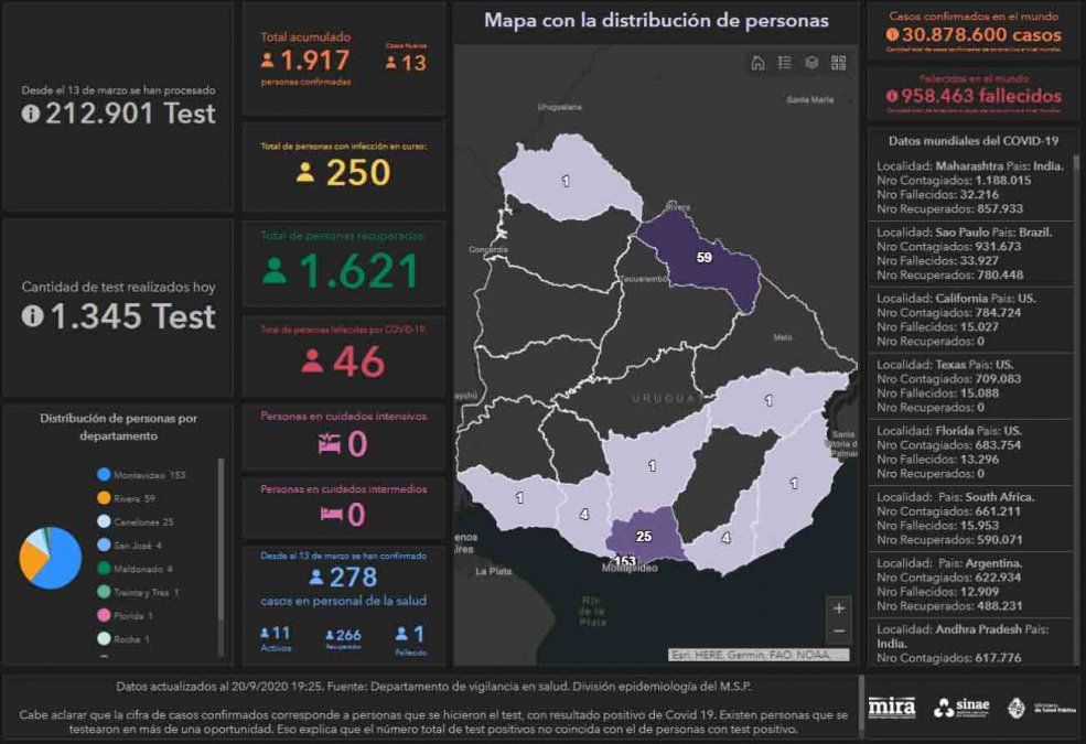 Según el último informe del Sistema Nacional de Emergencias (SINAE) actualmente hay 250 personas cursando la enfermedad y no hay pacientes internados ni en CTI ni en cuidados intermedios. Los departamentos con casos activos al día de hoy son 10: Artigas, Canelones, Colonia, Florida, Maldonado, Montevideo, Rivera, Rocha, San José y Treinta y Tres.