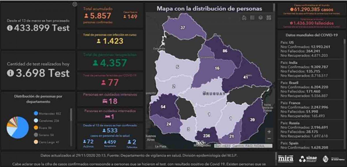 El informe del SINAE reportó este lunes que hay 1.423 personas cursando la enfermedad, de los cuales 18 se encuentran internadas en cuidados intensivos y uno en cuidados intermedios. Los departamentos con casos activos al día de hoy son 16: Artigas, Canelones, Cerro Largo, Colonia, Durazno, Florida, Lavalleja, Maldonado, Montevideo, Paysandú, Río Negro, Rivera, Rocha, San José, Soriano y Tacuarembó.