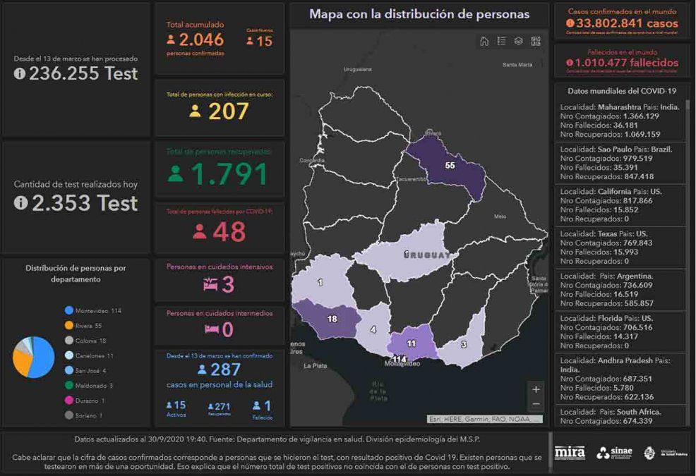 El informe de esta jornada presenta una nota de aclaración del SINAE: "ayer se informaron 2033 casos positivos confirmados, hoy se informan 15 casos nuevos y un total de 2046 positivos. Según consigna el reporte del MSP, la diferencia se explica porque “se eliminaron 2 casos por no estar cursando su enfermedad en el país”.
