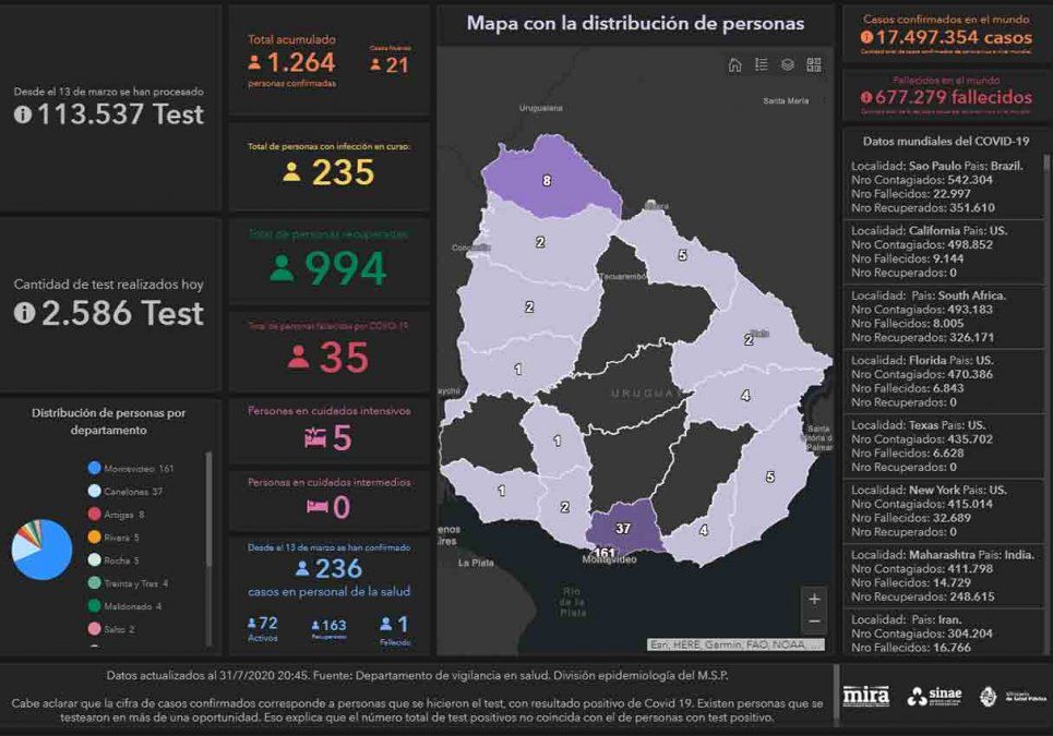 Además hay 235 personas cursando la enfermedad y cinco pacientes internados en CTI. Los departamentos con casos activos son: Artigas, Canelones, Cerro Largo, Colonia, Flores, Maldonado, Montevideo, Paysandú, Río Negro, Rivera, Rocha, Salto, San José y Treinta y Tres.
