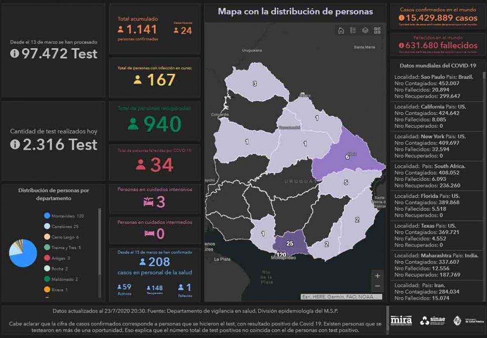 Uruguay registró este jueves 24 casos nuevos de coronavirus Covid-19, lo que da una cifra total de 1.141 casos positivos acumulados desde que se declaró la emergencia sanitaria el 13 de marzo.