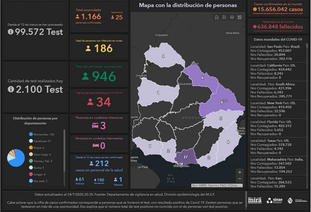 Uruguay sumó este viernes 25 casos nuevos de coronavirus Covid-19, lo que da una cifra total de 1166 positivos acumulados desde que comenzó la emergencia sanitaria en el territorio. Del total, 13 corresponden a Montevideo, cinco a Rivera, dos a Rocha, y los restantes pertenecen a los departamentos de Artigas, Canelones, Colonia, Maldonado y San José.