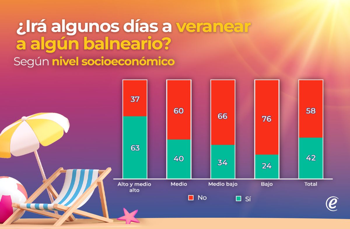 El nivel socio-económico, precisamente, discrimina fuertemente esta posibilidad. Entre las personas de estratos socio-económicos altos y medio altos es donde se encuentra una mayor frecuencia de concurrencia a balnearios: casi dos de cada tres (63%) lo hacen. La proporción disminuye en los estratos medios y medio bajos, y aún más en los estratos bajos, donde tres de cada cuatro (76%) permanece en sus hogares en esta época del año.