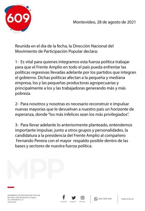 “Para llevar adelante lo anteriormente planteado, entendemos importante impulsar, junto a otros grupos y personalidades, la candidatura a la presidencia del Frente Amplio al compañero Fernando Pereira con el mayor respaldo posible dentro de las bases y sectores de nuestra fuerza política”, concluye el MPP.