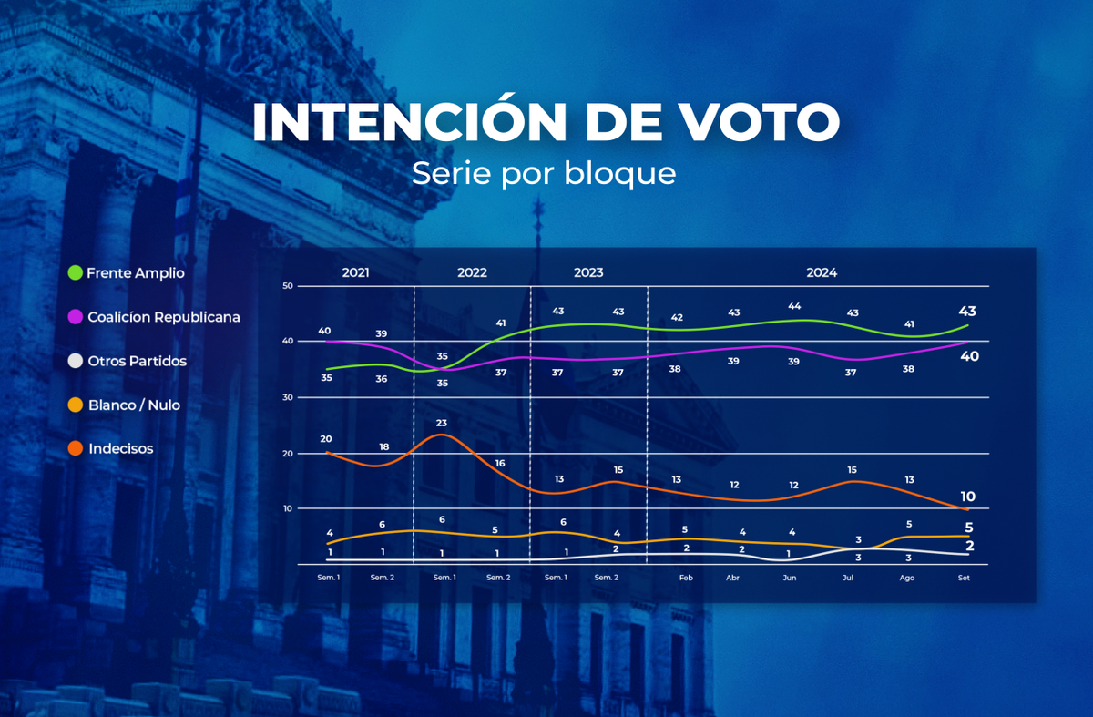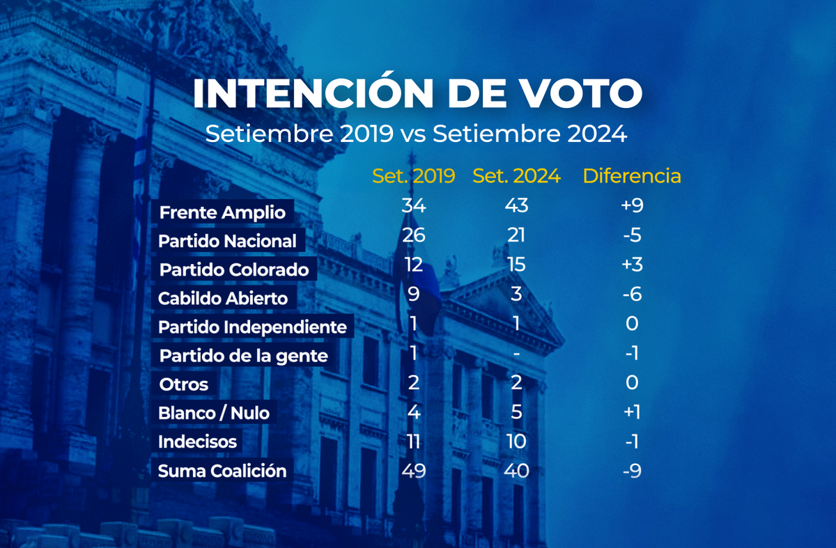 En términos de bloque, el Frente Amplio está 9 puntos por encima que en setiembre de 2019, y los partidos de la Coalición, sumados, 9 puntos por debajo.