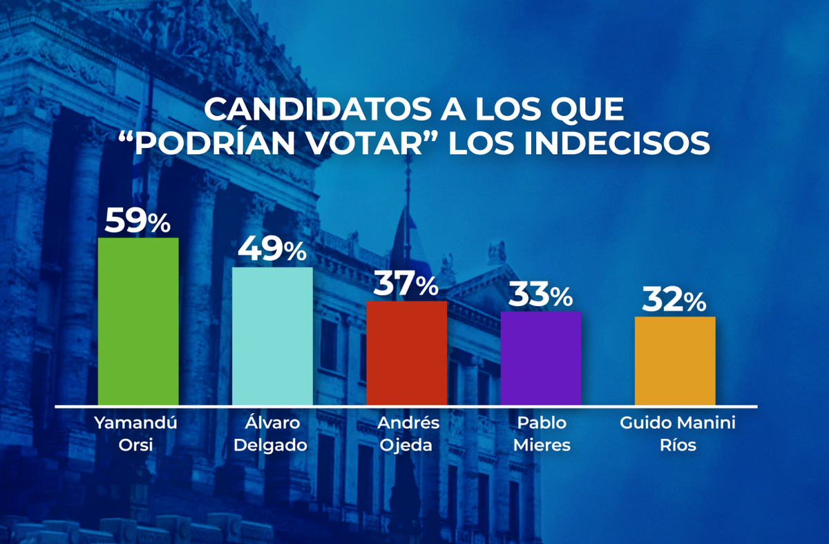 Por último, muestran posibilidad de votar a diferentes candidatos. 59% dice que “podría votar” por Yamandú Orsi, pero 49% dice lo mismo de Álvaro Delgado y 37% de Andrés Ojeda. También, 33% dice que podría votar a Pablo Mieres y 32% a Guido Manini Ríos. Por tanto, los principales candidatos del sistema parecen tener potencial de crecer en este segmento en esta recta final.