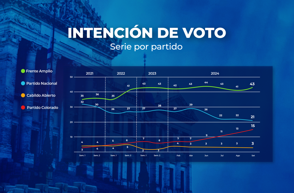 Si se comparan los resultados actuales con los de la medición anterior, el Frente Amplio crece dos puntos (de 41% a 43%), el Partido Nacional pierde 1 (de 22% a 21%), el Partido Colorado crece 2 puntos (de 13% a 15%), Cabildo Abierto permanece igual (3%), y el Partido Independiente suma 1% (que no sumaba en la medición anterior).