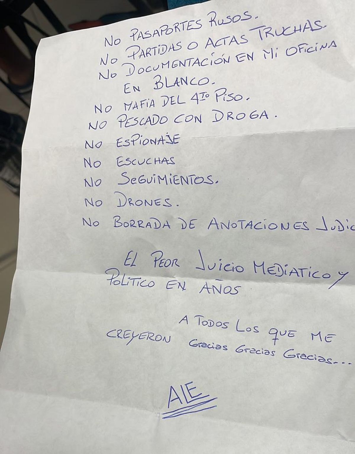 El abogado de Alejandro Astesiano, Marcos Prieto, mostró y leyó ante los medios de comunicación una nota de puño y letra escrita por su defendido en la que resume su posición sobre el proceso judicial que terminó este miércoles con una condena de cuatro años y medio de prisión por cuatro delitos: asociación para delinquir, tráfico de influencias, conjunción de interés público y personal, y revelación de secreto.