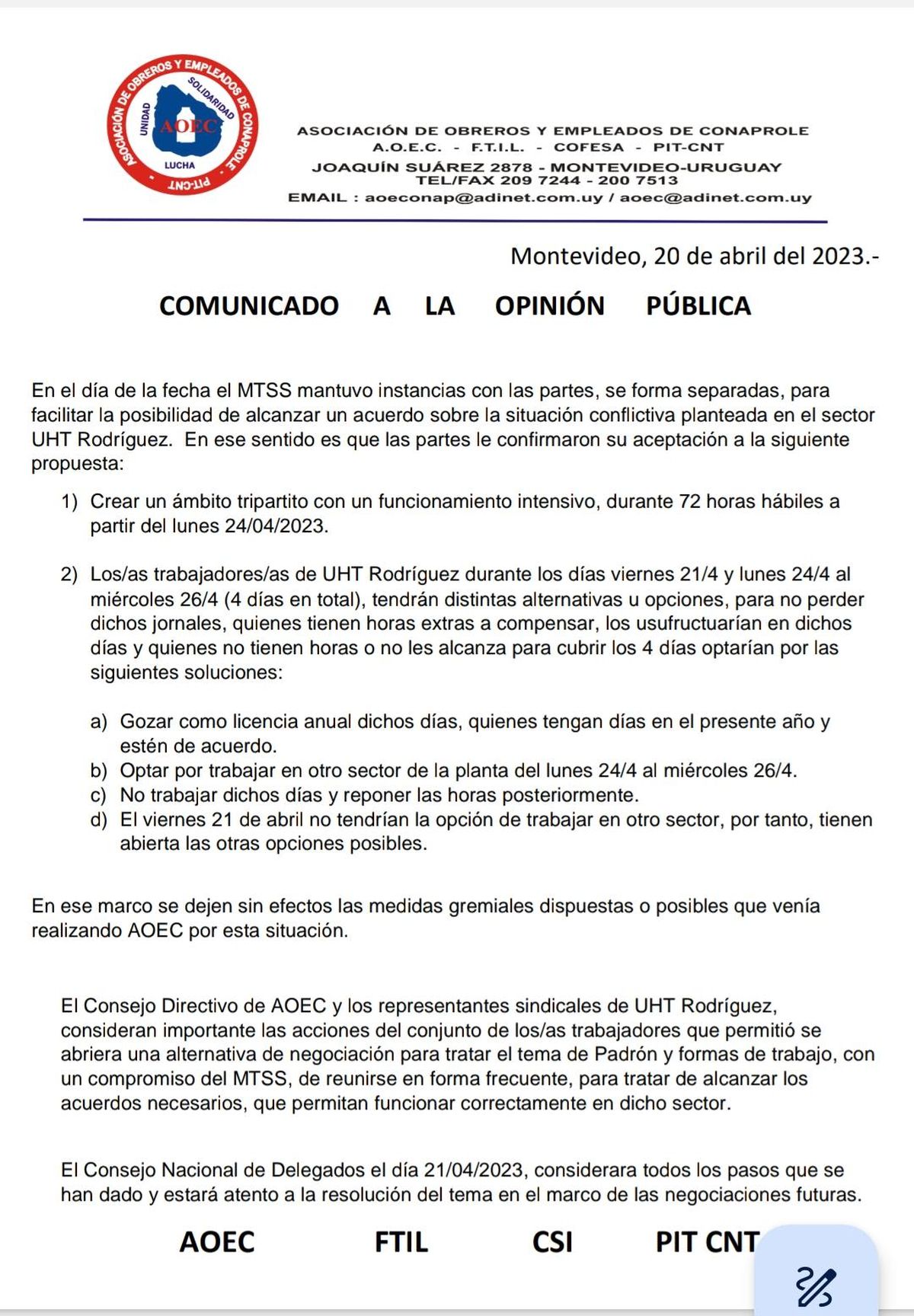 ONFLIEste jueves hubo instancias bilaterales del Ministerio de Trabajo con los trabajadores y la empresa Conaprole por el conflicto en la planta de Rodríguez. La cartera les entregó una propuesta que fue aceptada por las partes y las medidas gremiales quedan sin efecto, comunicaron desde la Asociación de Obreros y Empleados de Conaprole (AOEC).