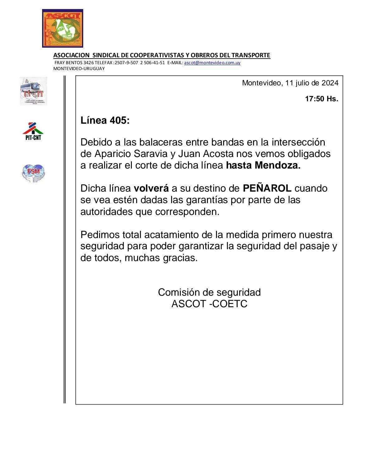 La Asociación Sindical de Cooperativistas y Obreros del Transporte (Ascot) indicó en un comunicado: "Debido a las balaceras entre bandas en la intersección de Aparicio Saravia y Juan Acosta nos vemos obligados a realizar el corte de la línea hasta Mendoza".