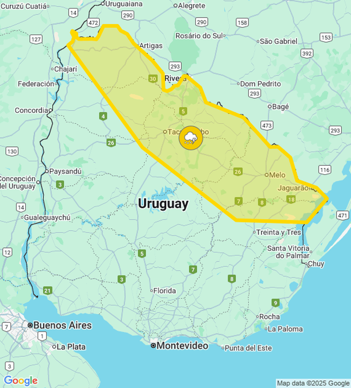 El Instituto Uruguayo de Meteorología (Inumet) volvió a actualizar la advertencia amarilla por persistencia de tormentas puntualmente fuertes, y ahora rige hasta las 21:00 horas para localidades de siete departamentos.