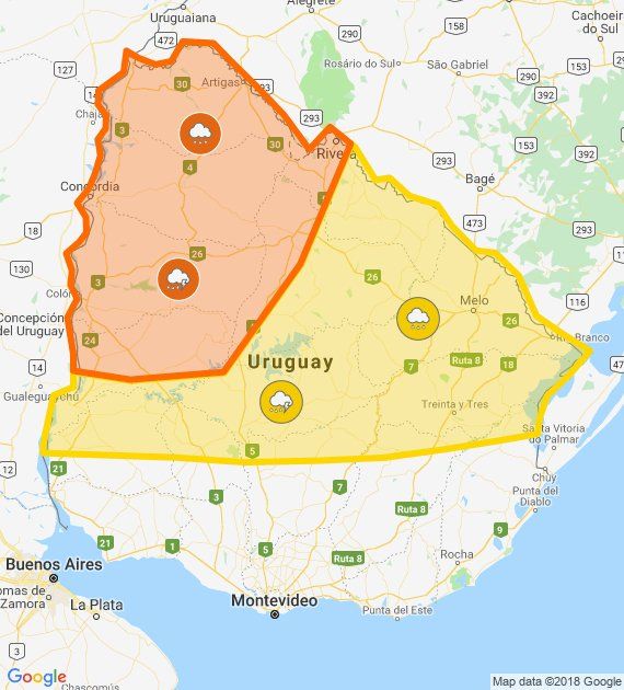 En tanto la alerta amarilla es para el noreste y centro del país, alcanzando a parte de Rivera, Tacuarembó, Cerro Largo, Treinta y Tres, Durazno, Soriano, Río Negro, Lavalleja, Florida y el extremo norte de Rocha.