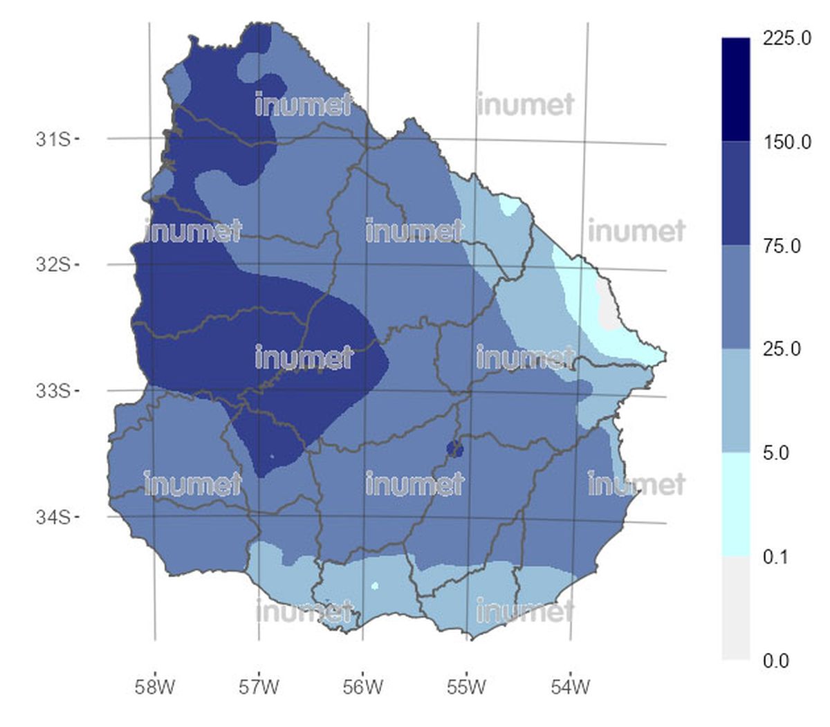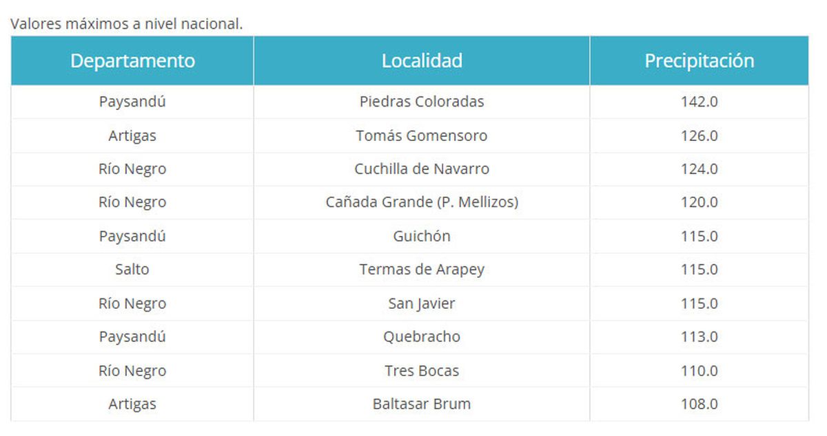 De acuerdo al informe oficial, hasta las 7 de la mañana de este sábado se registró un acumulado de 142 mm en Paysandú, 126 en Artigas y 124 en Río Negro.