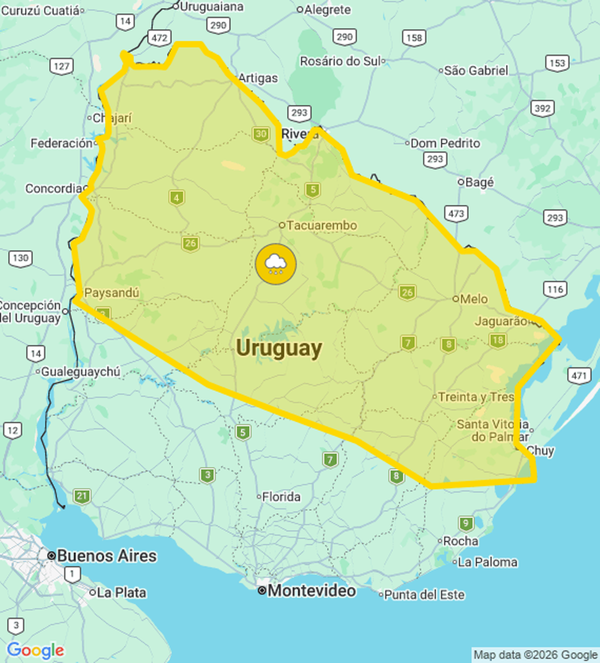 El Instituto Uruguayo de Meteorología (Inumet) emitió una advertencia amarilla para gran parte del país por persistencia de lluvias abundantes. Se actualizará a la hora 12:00.