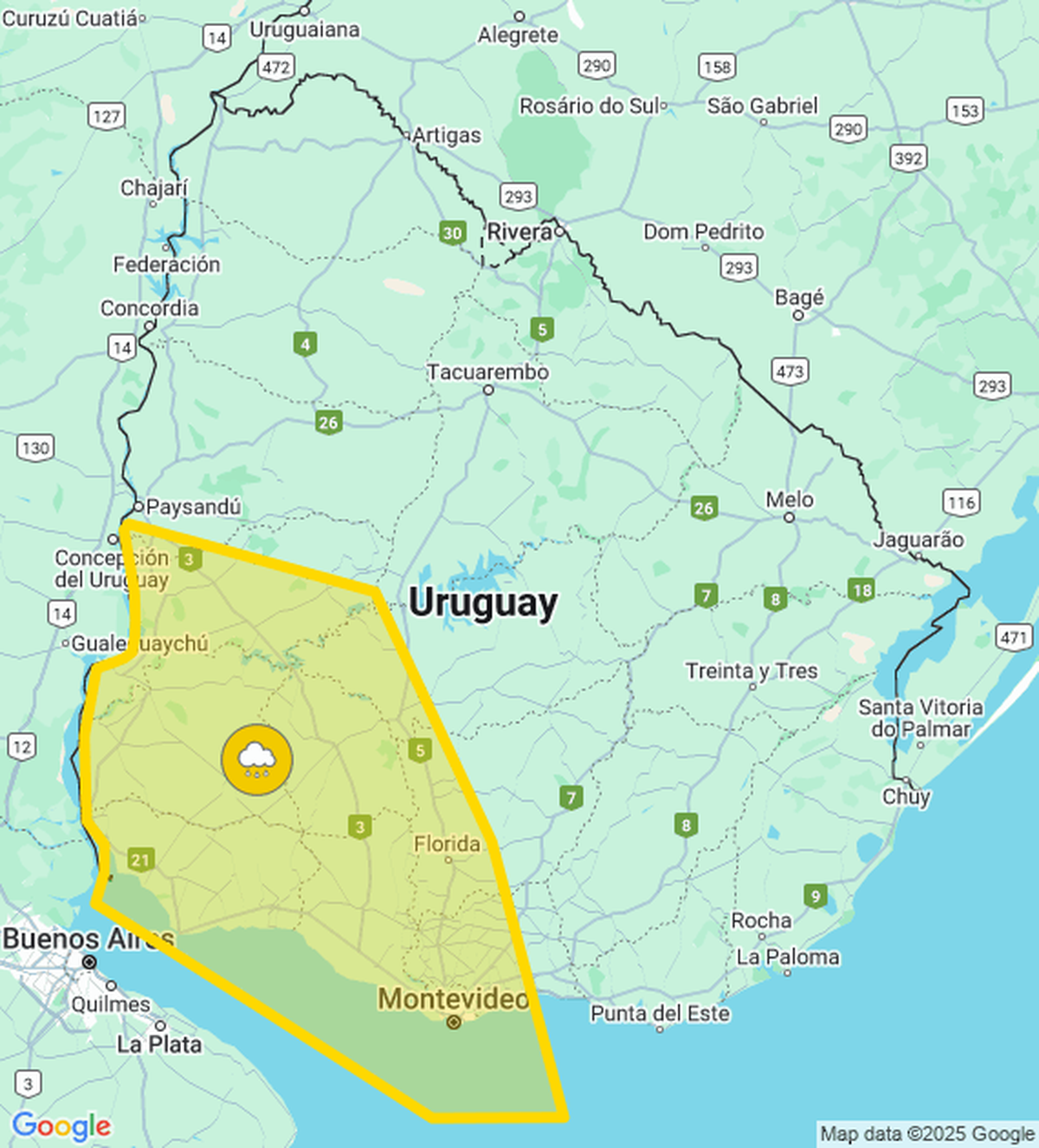 Gran parte del país bajo advertencia amarilla por tormentas puntualmente fuertes y lluvias abundantes