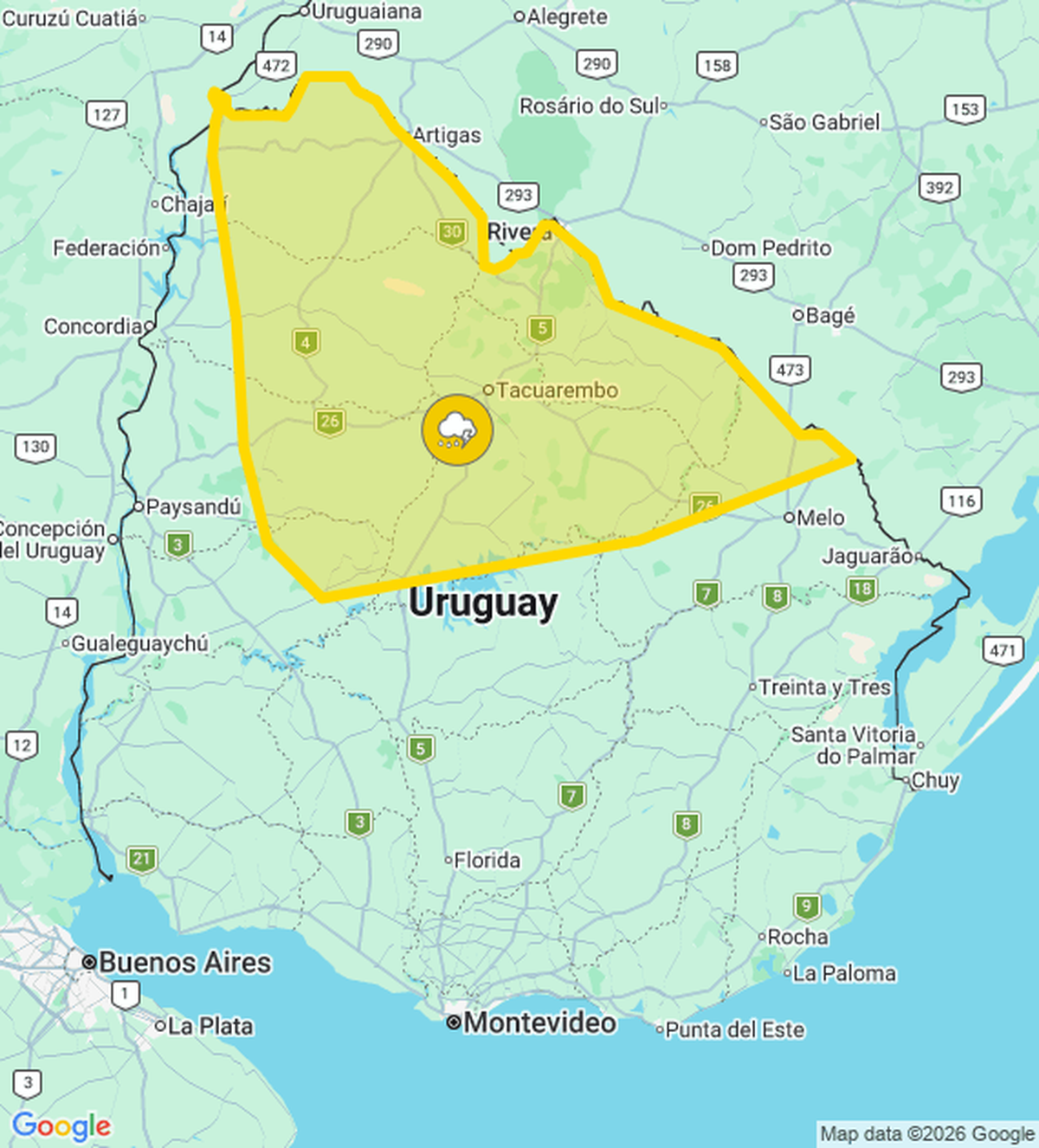 El Instituto Uruguayo de Meteorología (Inumet) emitió una advertencia amarilla para gran parte del país al norte del río Negro, en la tarde de este lunes. Se actualizará a la hora 16:00.
