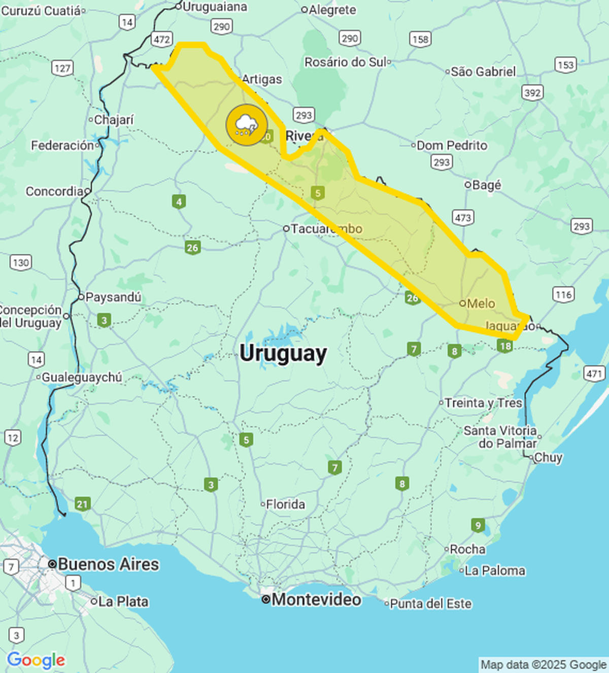 Advertencia amarilla por tormentas puntualmente fuertes y lluvias abundantes para el noreste del país, informó el Instituto Uruguayo de Meteorología (Inumet).