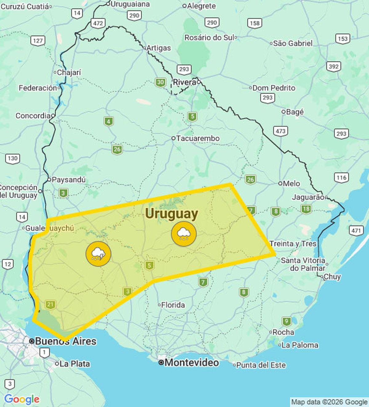 Advertencia amarilla por la persistencia de tormentas puntualmente fuertes y lluvias abundantes