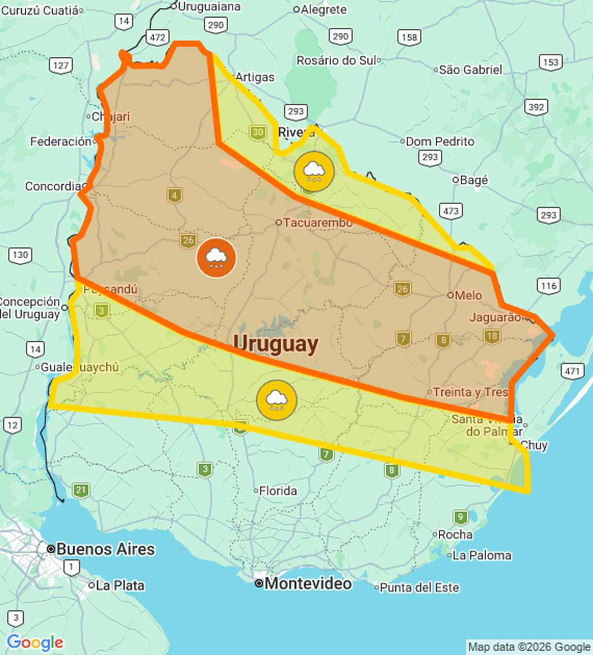 La advertencia naranja y amarilla por mucha lluvia en las próximas horas rige para gran parte del país, desde Artigas hasta Soriano en el oeste y Rocha en el este.