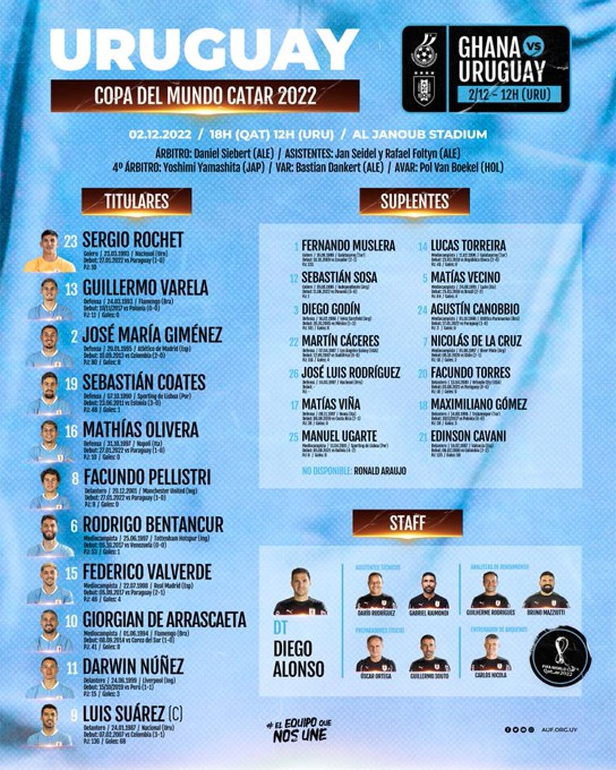 Diego Alonso hizo los cambios que muchos pedían y hasta reclamaban: Giorgian De Arrascaeta y Facundo Pellistri van desde el comienzo en el decisivo partido ante Ghana donde solo sirve la victoria.