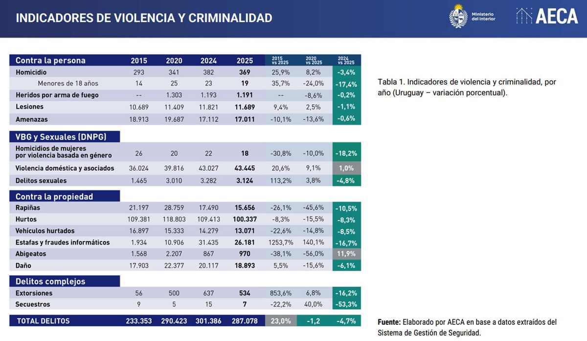 Estas son las últimas cifras presentadas por el Ministerio del Interior, con la comparación del año cerrado 2025 respecto a 2024, al 2020 y al 2015. Además se muestra la variación cada cinco años: 2015, 2020 y 2025.