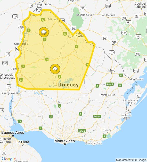 Inumet lanzó este mediodía un alerta amarillo en la zona norte de Uruguay por tormentas fuertes y lluvias intensas