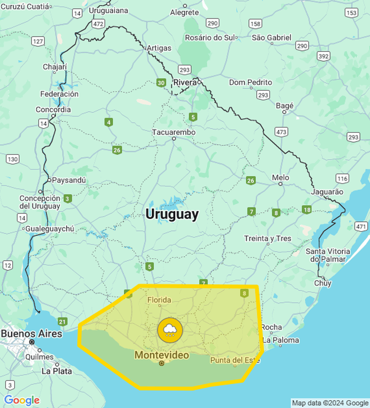 Rige una alerta amarilla por lluvias intensas para localidades del sur del país, según el Instituto Uruguayo de Meteorología (Inumet).
