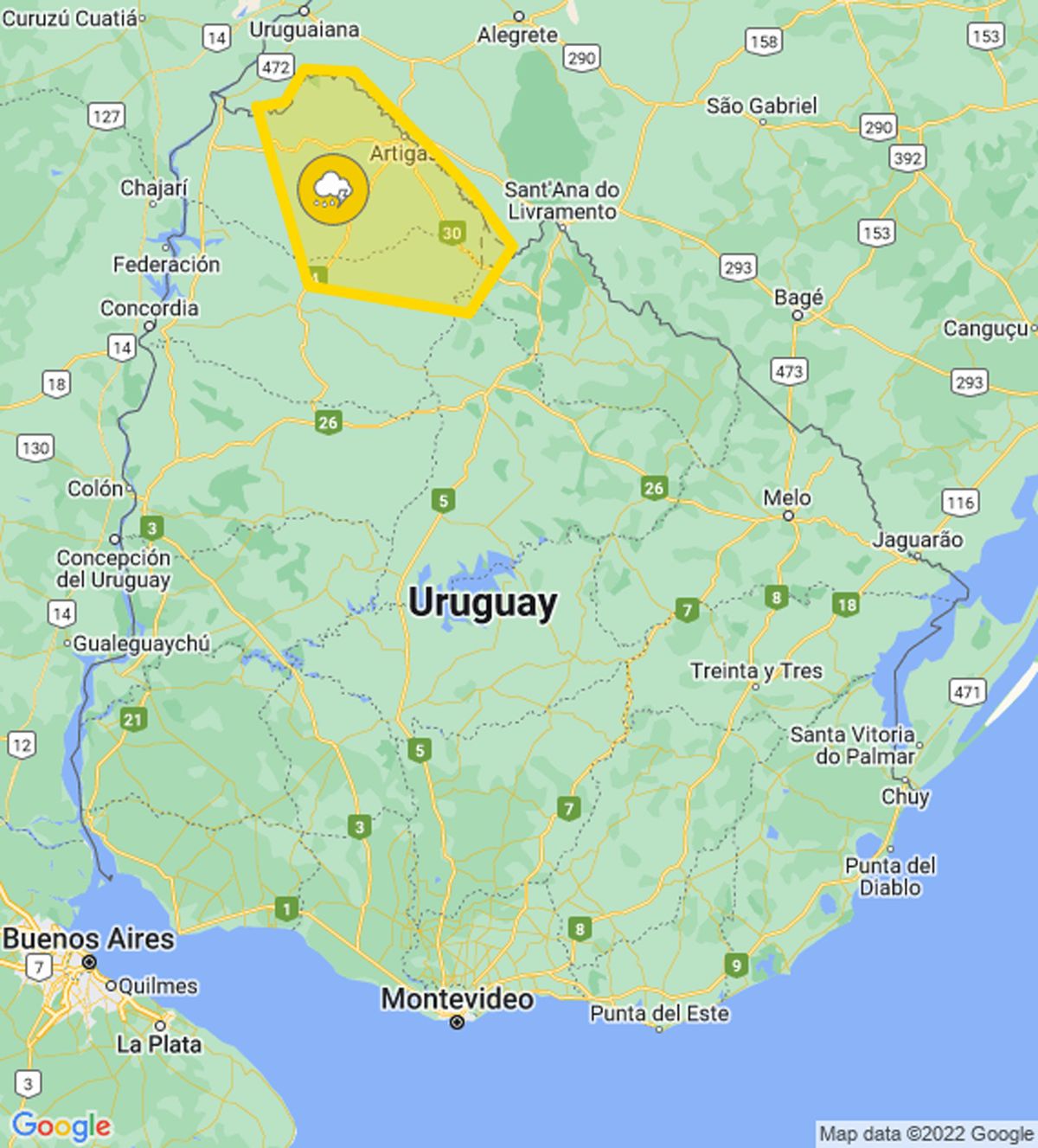 Meteorología publicó este sábado de noche una alerta amarilla por tormentas fuertes para el extremo norte del país, en Artigas y parte de Salto.