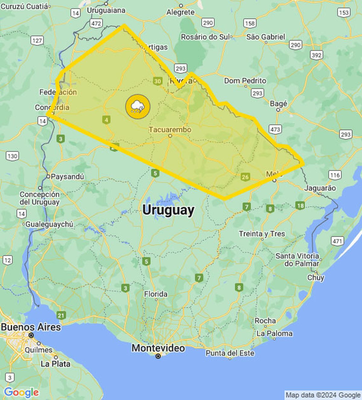 “Una perturbación atmosférica asociada a masa de aire húmeda e inestable afecta el país, generando tormentas algunas puntualmente fuertes. Cabe destacar que en zonas de tormentas se podrán registrar lluvias abundantes en cortos períodos, ocasional caída de granizo, intensa actividad eléctrica y rachas de vientos fuertes. Se continuará monitoreando la situación y se informará ante eventuales cambios”, dice el informe oficial.