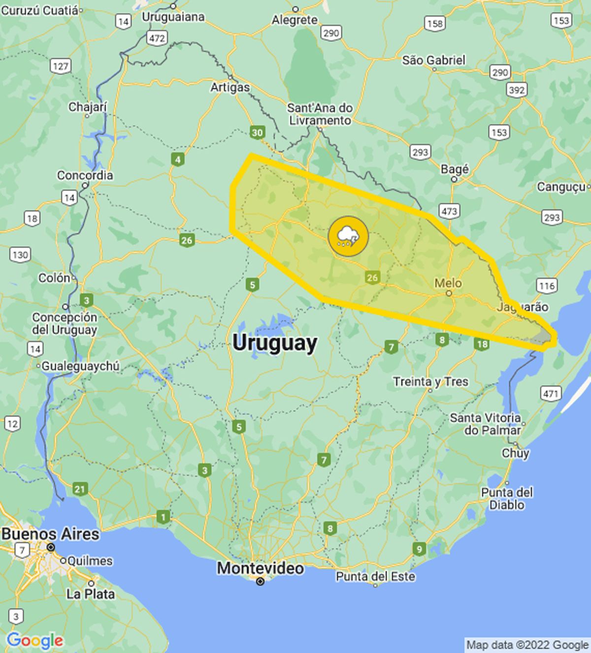 La nueva alerta amarilla de Meteorología afecta al noreste del país, parte de Rivera, Tacuarembó y Cerro Largo.