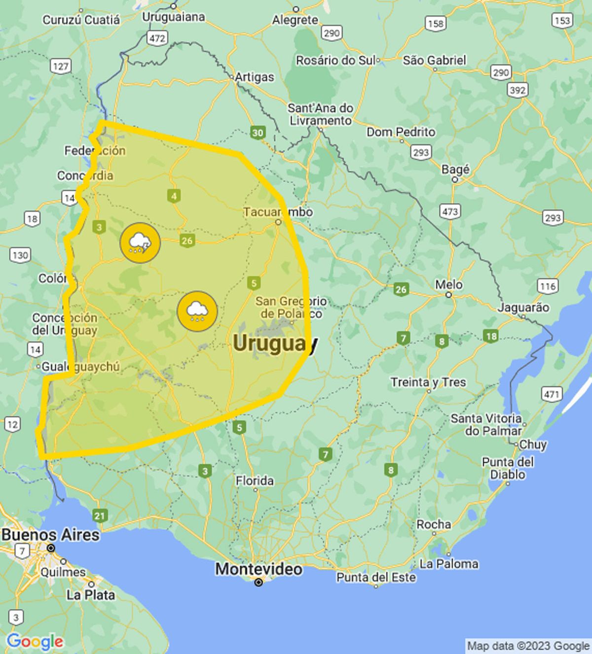 Meteorología amplió a media mañana su alerta amarilla por tormentas fuertes y lluvias intensas para el litoral oeste y en centro del país, desde Salto a Soriano y parte de Tacuarembó, Durazno y Flores (ver mapa).