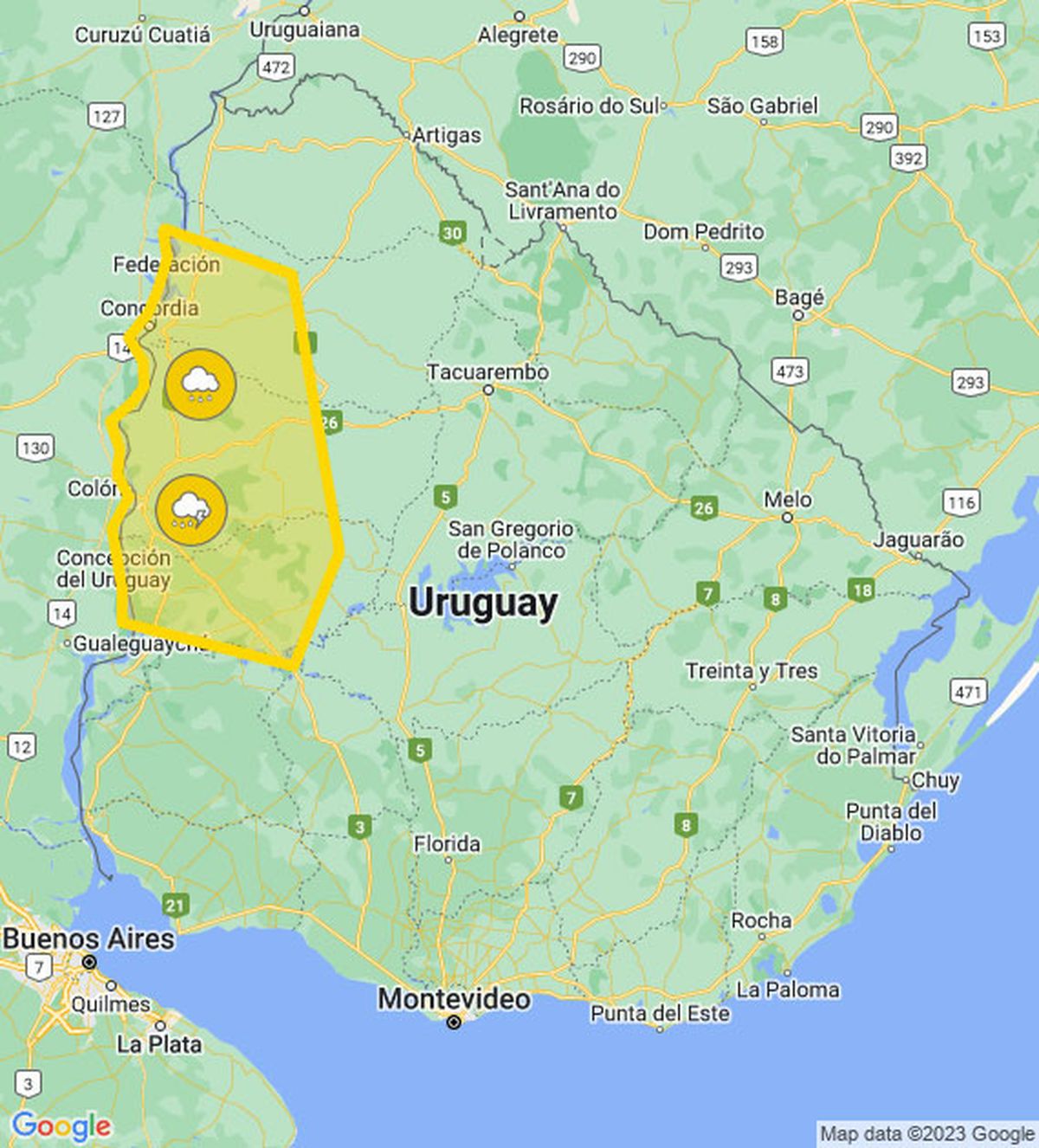 Meteorología publicó a la hora 7 una alerta amarilla por tormentas fuertes y lluvias intensas hasta la hora 10. Afecta a tres departamentos del litoral oeste: ver mapa.