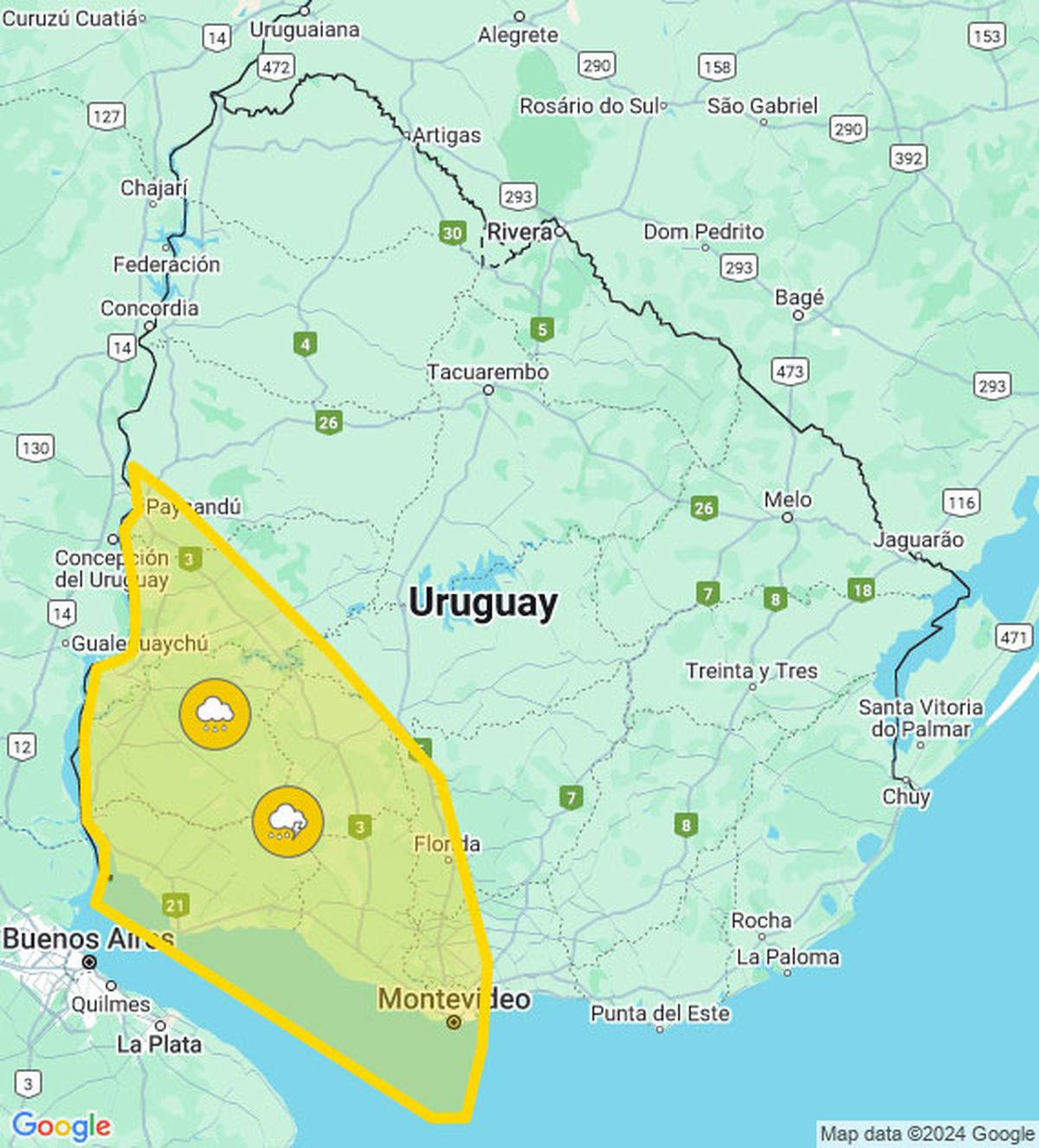 La alerta amarilla de Meteorología por tormentas fuertes y lluvias intensas rige para una parte del suroeste y Montevideo.