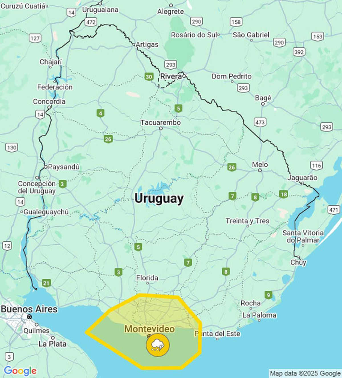 La alerta amarilla del Inumet por tormentas puntualmente fuertes alcanza a todo Montevideo y el área metropolitana, (ver mapa).