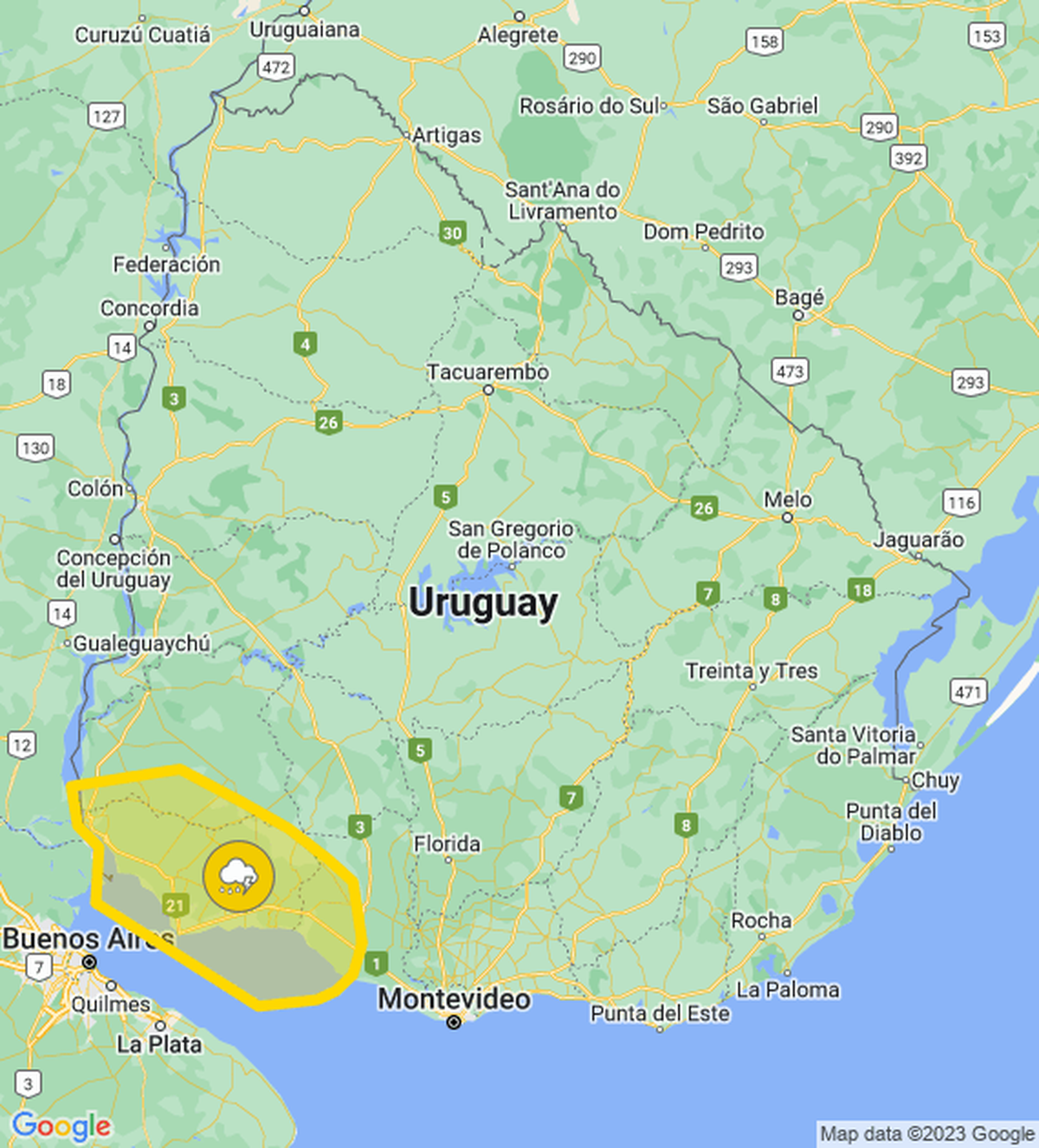 El Instituto Uruguayo de Meteorología emitió una alerta amarilla por tormentas fuertes para localidades de tres departamentos al suroeste del país.