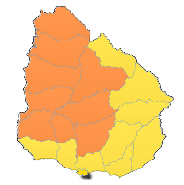 El resto del país (Rivera, Cerro Largo, Treinta y Tres, Lavalleja, Rocha, Maldonado, Colonia, San José, Canelones y Montevideo) se encuentra bajo alerta Amarilla por el mismo fenómeno.
