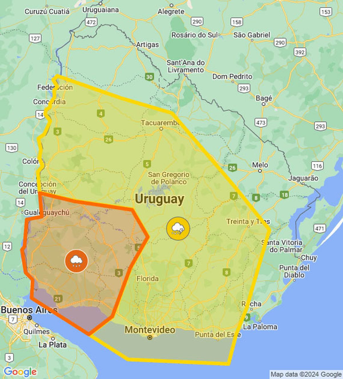 Meteorología elevó el nivel de advertencia y a las 11:50 publicó una nueva alerta naranja por “persistencia de lluvias” y otra alerta amarilla por “persistencia de tormentas y lluvias”. Entre las dos abarcan casi todo el país: ver mapa.