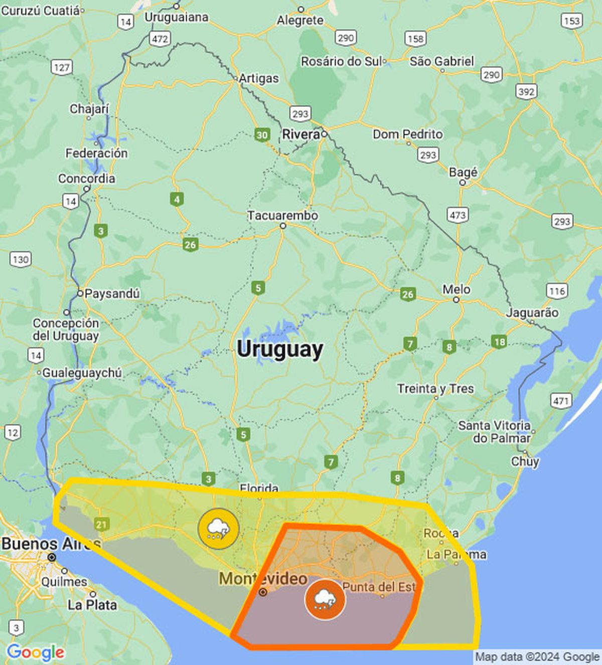 La alerta naranja de Meteorología es por tormentas fuertes y lluvias intensas, y ahora, además de Montevideo y el área metropolitana, se extiende a la costa de Canelones y Maldonado. Además la alerta amarilla abarca a toda la costa sur del país, desde Colonia a Rocha, (ver mapa abajo).