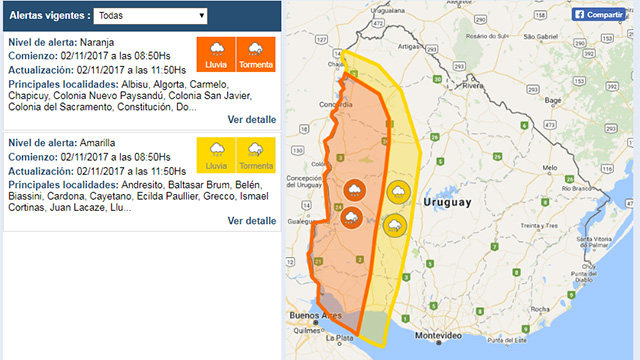 Paullier, Grecco, Ismael Cortinas, Juan Lacaze, Lluveras, Nueva Helvecia, Rosario, Termas del Arapey y Trinidad está vigente una advertencia de nivel amarillo.