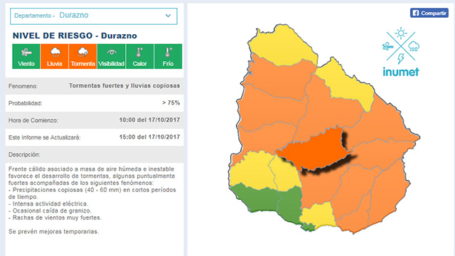 En los departamentos de Artigas, Rivera, Soriano, Flores y Canelones rige una alerta amarilla por los mismos fenómenos pero de menor intensidad.