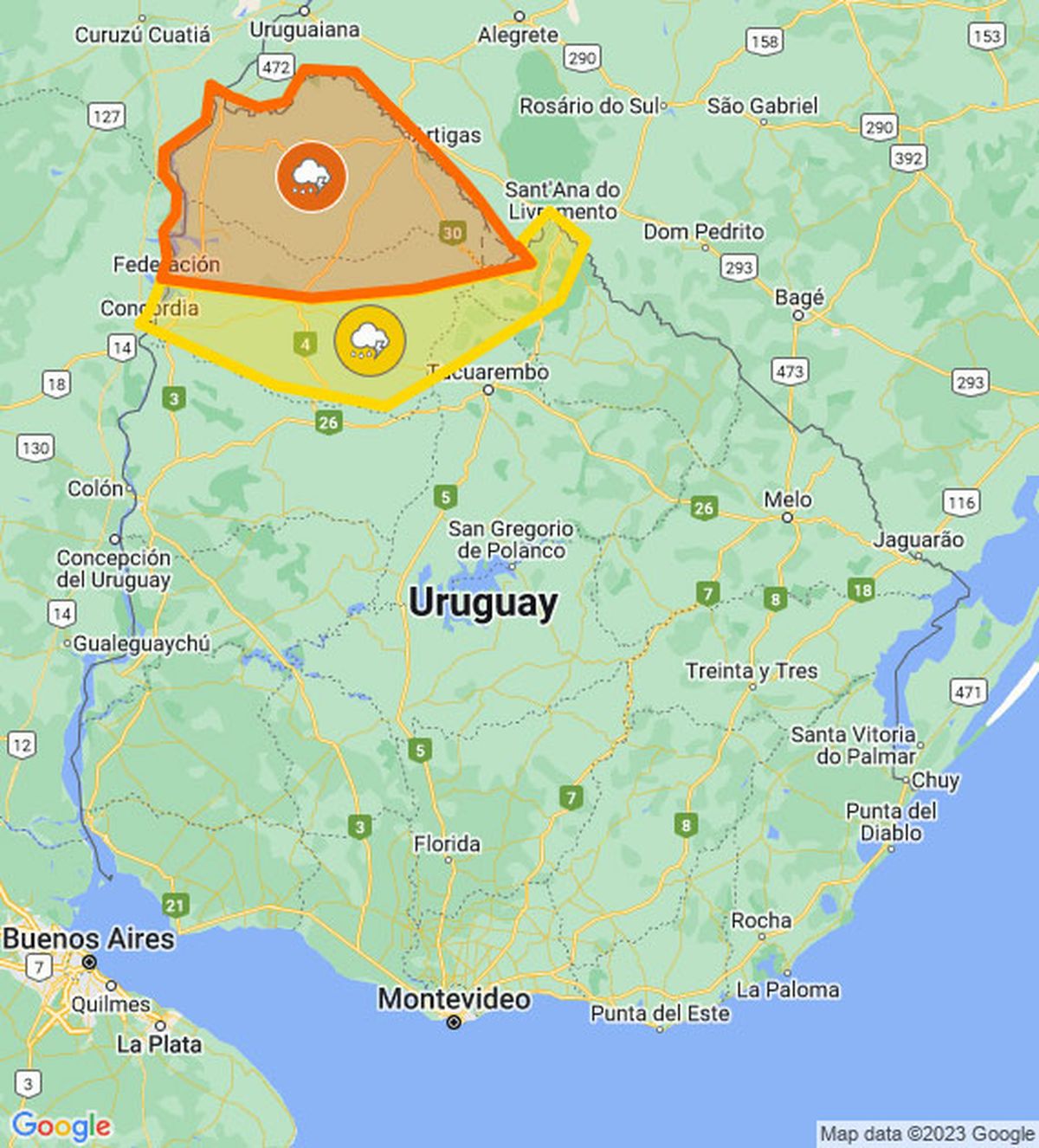 La alerta naranja y amarilla por tormentas fuertes y lluvias intensas es para el extremo norte del país, especialmente Artigas y Paysandú, (ver mapa).