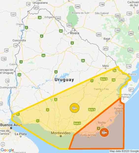 Además rige una advertencia amarilla con vientos de entre 40-60 km/hora para las siguientes localidades: