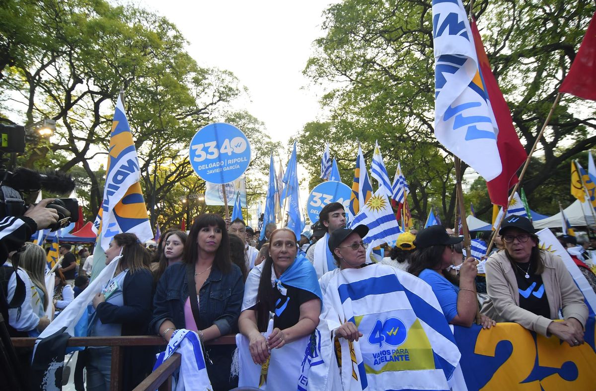 El acto final de campaña del candidato de la Coalición Republicana, Álvaro Delgado, en la previa al balotaje del domingo, comenzó sobre las 19:30 horas. Desde antes, alrededor del Obelisco, militantes se concentraron con las banderas de los distintos partidos -Nacional, Colorado, Independiente, Cabildo Abierto y el Constitucional y Ambientalista- y el pabellón uruguayo.