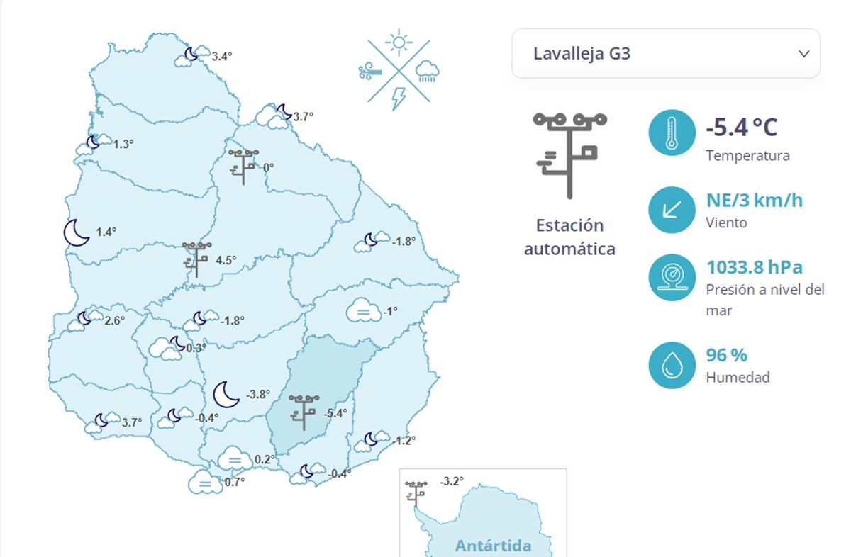 La estación automática de Meteorología en Lavalleja marcó este miércoles de mañana la temperatura más baja del país en medio del fío polar que se instaló sobre Uruguay en los últimos días.