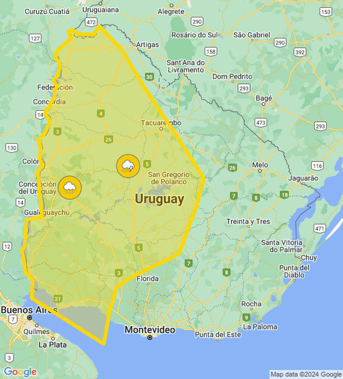 La alerta amarilla de Meteorología por tormentas fuertes y lluvias intensa abarca el litoral oeste y centro del país, (ver mapa).