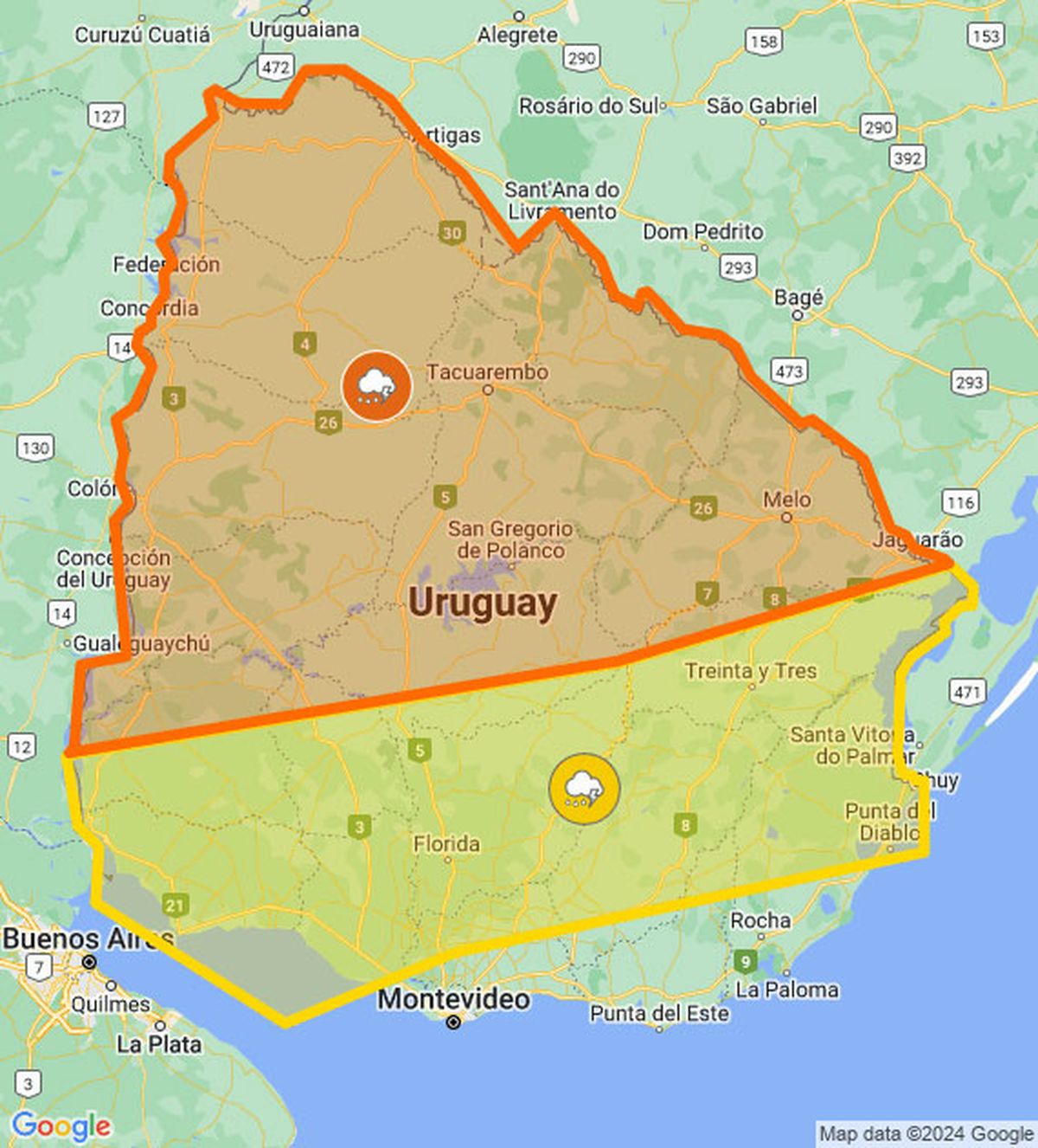 La alerta amarilla rige desde la misma hora pero para otra zona lindera a la alerta naranja, en el litoral oeste y centro del país.
